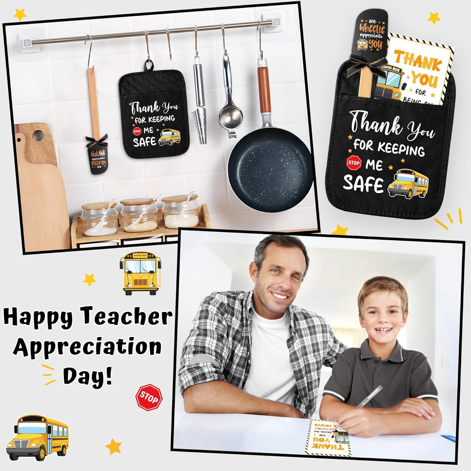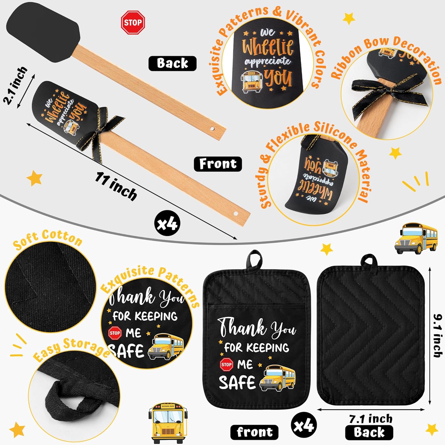 R HORSE 3Pcs Funny Pot Holder with Silicone Spatula and Greeting Card for Bus Driver Retirement Teacher Appreciation Gift Specification: Material: Pot holder: Cotton Spatula: Silicone and wooden handle Card: Cardboard Packaging includes: 4 x Pot holders with pocket 4 x Silicone spatulas and ribbon bows 4 x School bus driver appreciation theme cards