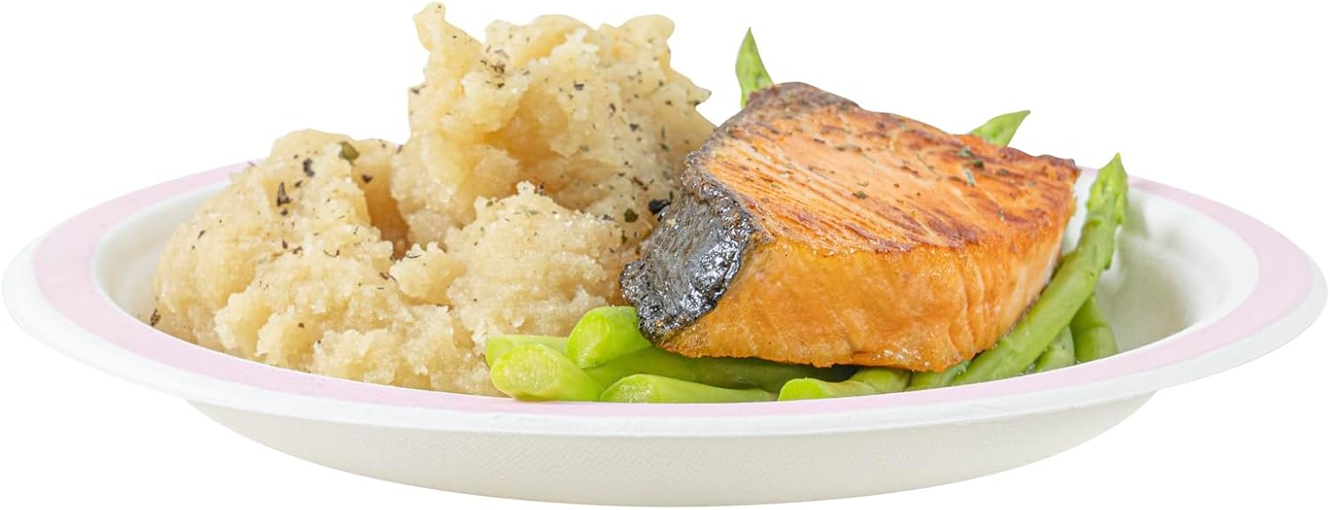 Enhance your service with elegance. Pulp Safe Bagasse Plates offer an efficient solution for sustainable dining, crafted from sugarcane bagasse to provide a sturdy alternative to traditional plastic. These bagasse plates are microwave-safe, allowing seamless reheating of hot dishes without compromising structural integrity. These plates support foodservice operations, aligning with sustainability goals while ensuring easy disposal. Featuring a charming pink rim, these plates double as pink disposable plates, adding a touch of sophistication to any table setting. Additionally, their freezer-safe nature makes them perfect for storing prepped meals and desserts, enhancing operational versatility. Measuring 6.10 inches in diameter, they are ideal for serving appetizers or small portions, catering to diverse menu offerings. Invest in these plates to elevate your dining experience while prioritizing the environment. Each order includes 100 Pulp Safe Bagasse Plates.