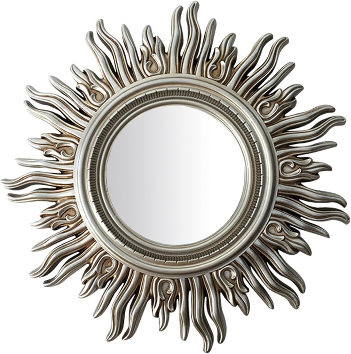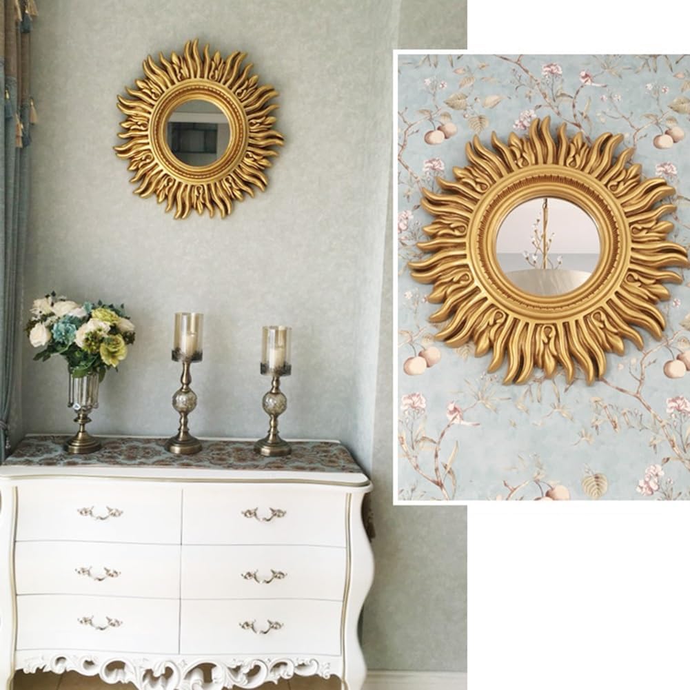 SpecificationProduct Name: Wall MirrorFrame Material: PU Style: EuropeanShape: RoundSize: 62cm/24inchColor classification: antique gold, antique silverThis home decor will make your room brighter and more vivid, can decorate bare walls and add color and texture to your home.Suitable for different styles of home: bedroom, living room, study, office, hotel, restaurant, cafe, wall art decoration and so on.Modern and impactful design but with a vintage vibe, these mirrors feature an antique style finish that allows them to blend comfortably with both modern and vintage décor. These mirrors go well with any decor and are a must-have!Package includes: wall mirror * 1Warm tips:1, Due to the size error of manual measurement, please prevail in kind.2, the product in the transportation process will inevitably appear scratches, will not affect normal use3, due to the shooting angle, light, display and other reasons, the color of the product in the picture may be slightly different from the real thing.