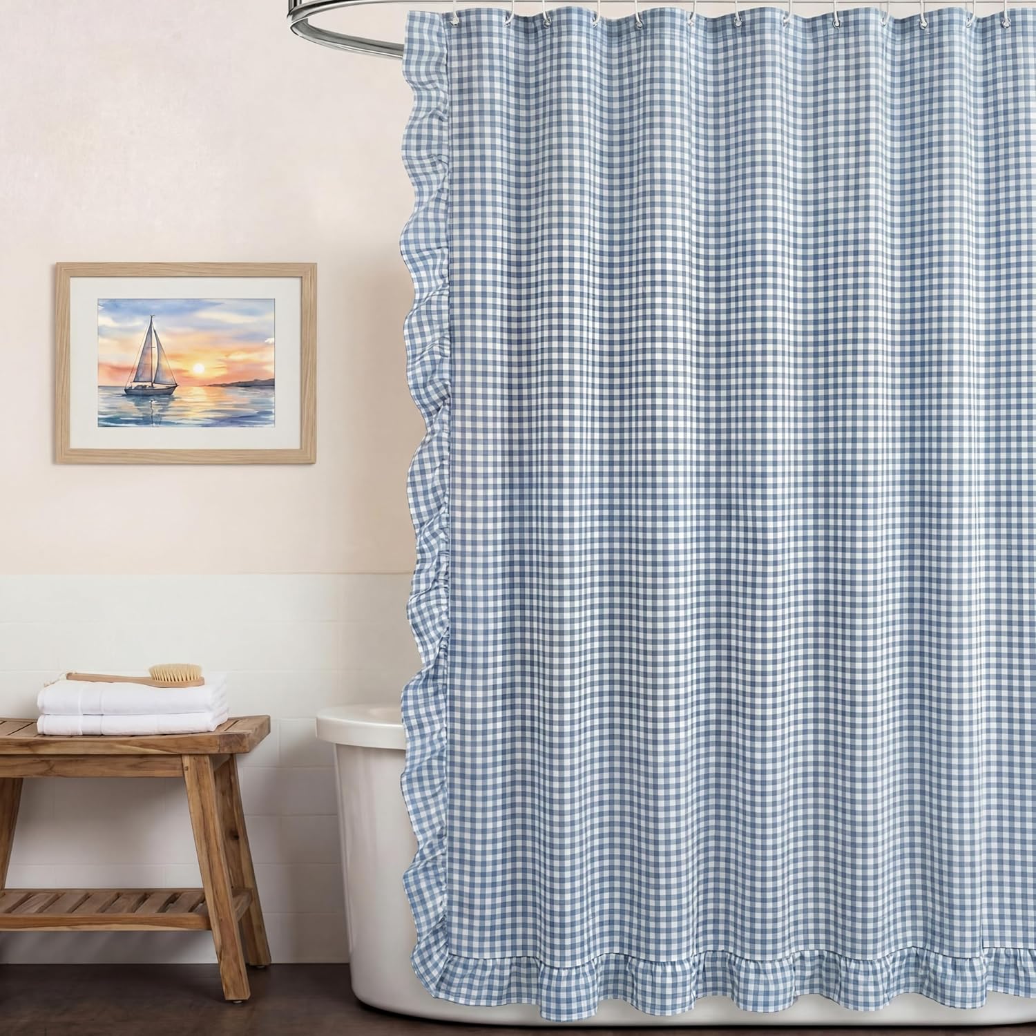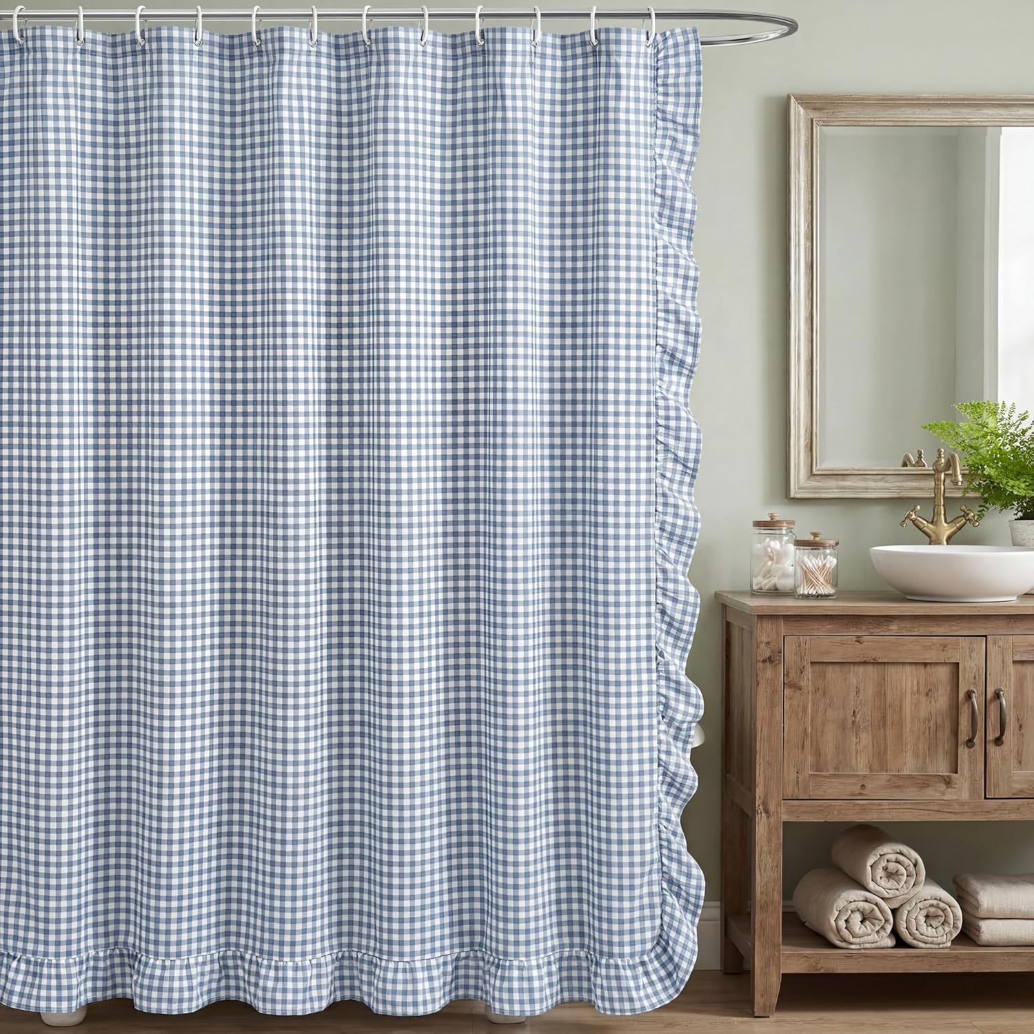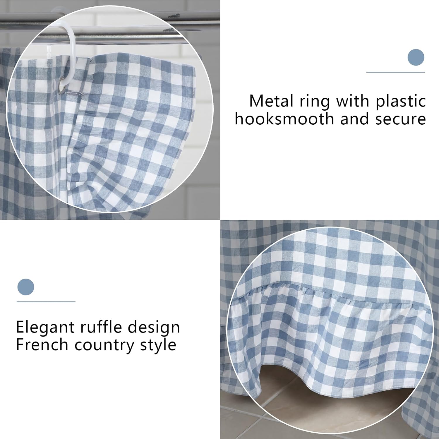Features: Charming bathroom decoration: This shower curtain features a classic gingham check pattern with ruffled detailing and button accents, creating charming farmhouse aesthetic for your bathroom. Wide use: Suitable for homes, hotels, clubs, gyms, apartments, and similar residential or commercial settings. The durable polyester material withstands humid bathroom environments while maintaining its appearance. Specifications: Material: cotton Color: dust blue Size: 72 x 72 inches / 180 x 180cm Package includes: 1 x Shower curtain set Notes: Manual measurement, please allow slight errors on size. The color may exist a slight difference due to different screen displays