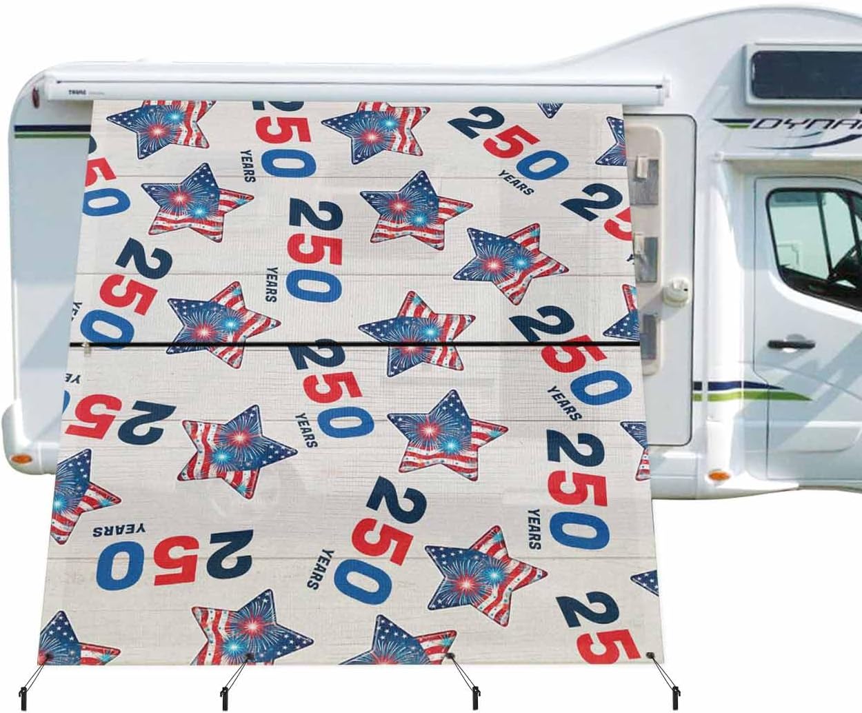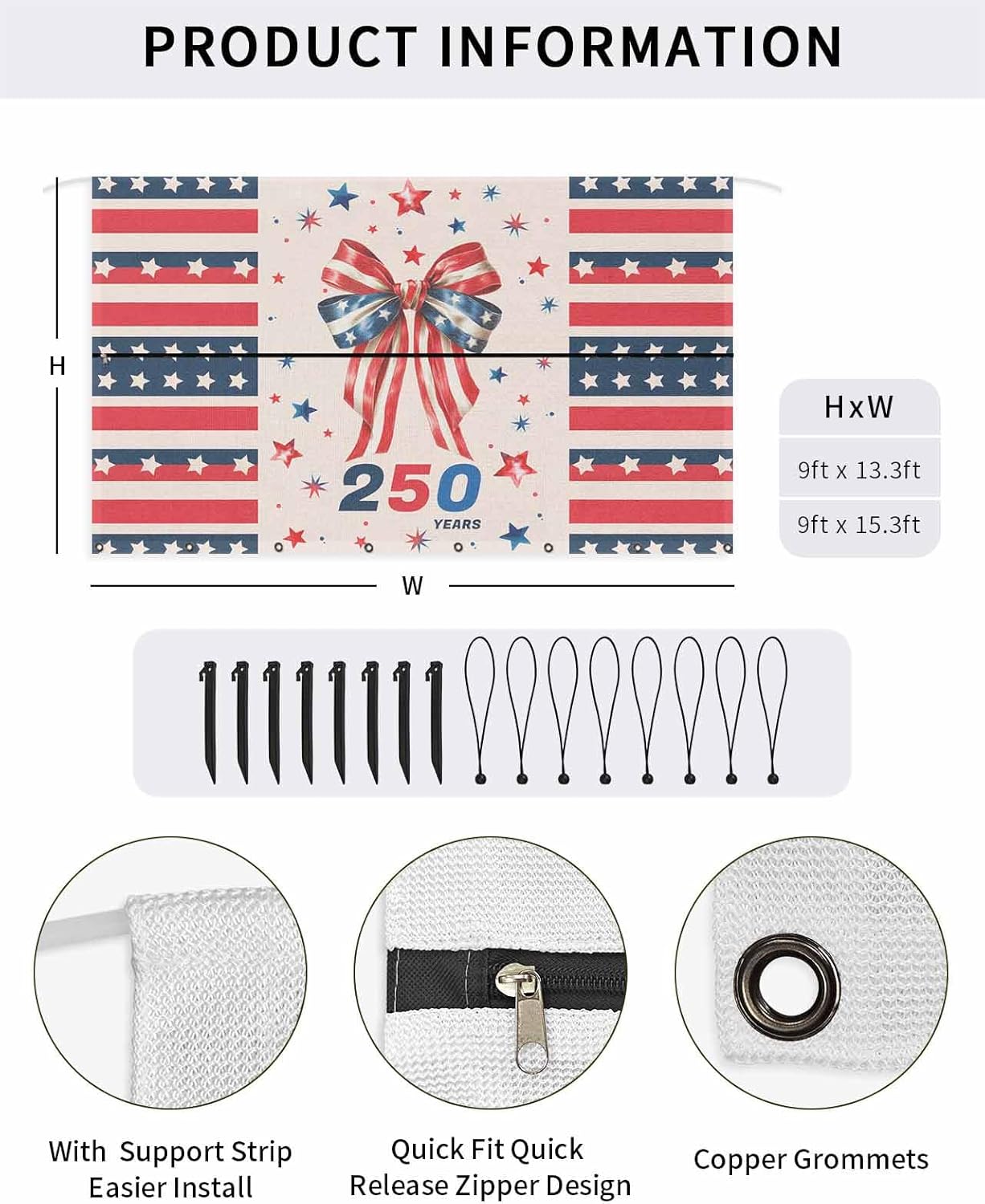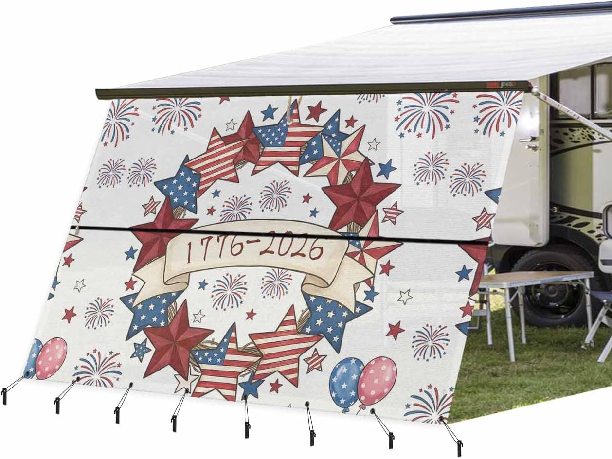 Premium High-Density Polyester Mesh Travel Trailer Awning Sun Shade Screen, An Essential Addition for Camping Trips.How to Choose Your Perfect Fitted SizeMethod A: Please measure your existing awning from center of arm to center of arm. This 9'x15'3" shade has a finished fabric measurement of 9' drop by 15'3" length and fit for 16' travel trailer awning.Method B: Measure your awning fabric length and choose same length of our travel trailer shade. For example you measure your awning fabric as 16', please simply choose this 9'x15'3" shade.Why Choose Our Travel Trailer Awning Side Shade1. These travel trailer sun shade screen help block out those crazy sun rays that try to beat you down while camping and also give you privacy when camping right next to others.2. Travel trailer awning shade screen can be easily fixed by sliding into the RV awning rail with coming poly-cord. You just leave the upper section on to roll in and out with the patio awning and zip on the lower section when needed.3. Bungees fastest fix compared to normal rope tie down. When the winds whip up and storms come in, you just unzip it and roll in the awning and stow the bottom section with the bungees, it's that easy.4. High-density material mesh has better durability and will retain its color after long-term use.The bottom of the travel trailer awning screen is equipped with 8 thick grommets that no crack by strong pulling and can be used normally in extreme weather.5. The travel trailer awning shade screen helps avoid your RV awning from being blown down and damaged by the wind.6. This travel trailer awning sunshade screen is designed to fit a wide range of popular awning systems, ensuring ease of use.Package Include8 x Plastic Stakes8 x Bungee Cords1 x Awning Shade Screen 9' x 15'3" (9 Feet Drop, 15.3 Feet Length)