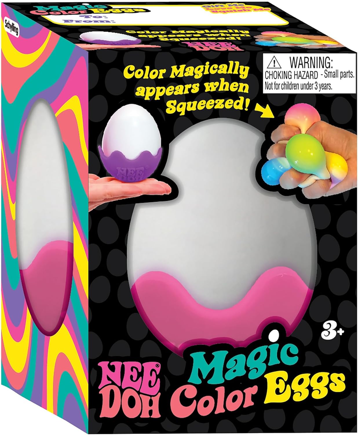 The groovy gratifying super soft, stretchy dough like glob NeeDoh is now available as a magical egg. NeeDoh Magic Color Egg still has all the irresistible power to find your best mellow and chill, and always returns to its original shape. But now with every squeeze, smush, and stretch you see a color sensation. It looks like a plain white egg in a colorful removeable shell, but when you squeeze it a marbleized raindow of colors appear. They are great in an Easter basket or to squish anytime of year.