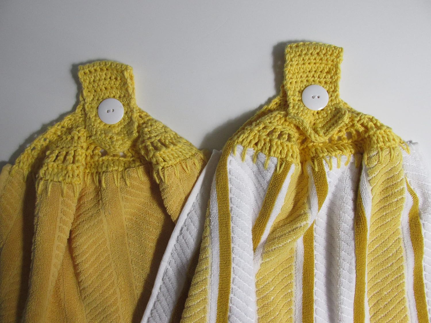 CROCHET TOPPED KITCHEN HAND TOWELS are perfect for keeping your towels in one place. Great for hanging on a oven door, cupboard, or refrigerator handle, these are made from One Whole Towel, folded in half, so it is thicker than most that are available. These are New, Large-sized, Best-Quality terry towels. Towel is 100% Cotton; crochet top is 100% Cotton yarn. Towels measure approximately 18" x 28", before folding in half. This is the entire towel; this towel is NOT cut in half. This listing is for a set of 2 coordinating Yellow Design towels with Yellow Cotton Crochet Top.