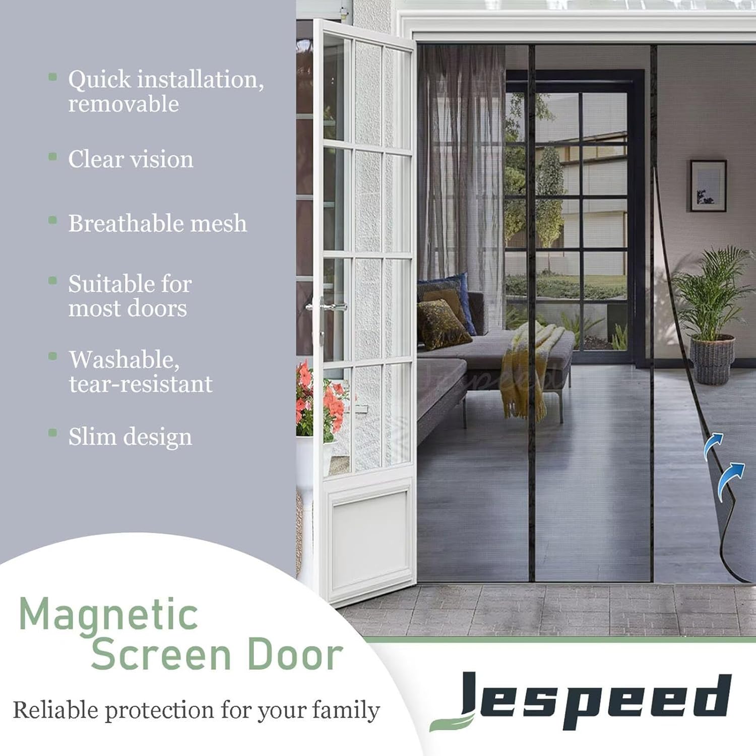 Jespeed will accompany you every day!Color: White/Black(Translucent)Style: ModernDimensions: Width x Height🔖Features:a. The thick and fine mesh prevents small things from entering.b. Allows air to circulate freely, making it ideal for use in bedrooms, living rooms and kitchens.c. Automatic magnetic closure after passing through, easy and convenient to use, easily pass through the screen door.d. Hook and loop tape installation design, no need to punch holes for installation.e. Removable and hand-washable, foldable for storage, reusable for multiple summers.📑Notes:1.Please refer to our size picture for careful measurement. Since measured manually, the product you receive may have a size error of 1-3cm (0.39-1.18 inches), please just choose a slightly larger size for in case.2. Make sure the center point of thetop side is slightly higher than the both side. Don’t allow too much screen to lay on the floor it will impact the effect of closing3. The screen door is folded in the package. If you have wrinkles when you receive the screen door, please don't worry. The wrinkles will disappear after you take out the screen door for a while.4. Due to different screen displays, there may be a slight color difference.📦Package included:1 x Magnetic screen door1 x User's guide1 x Magic tape roll