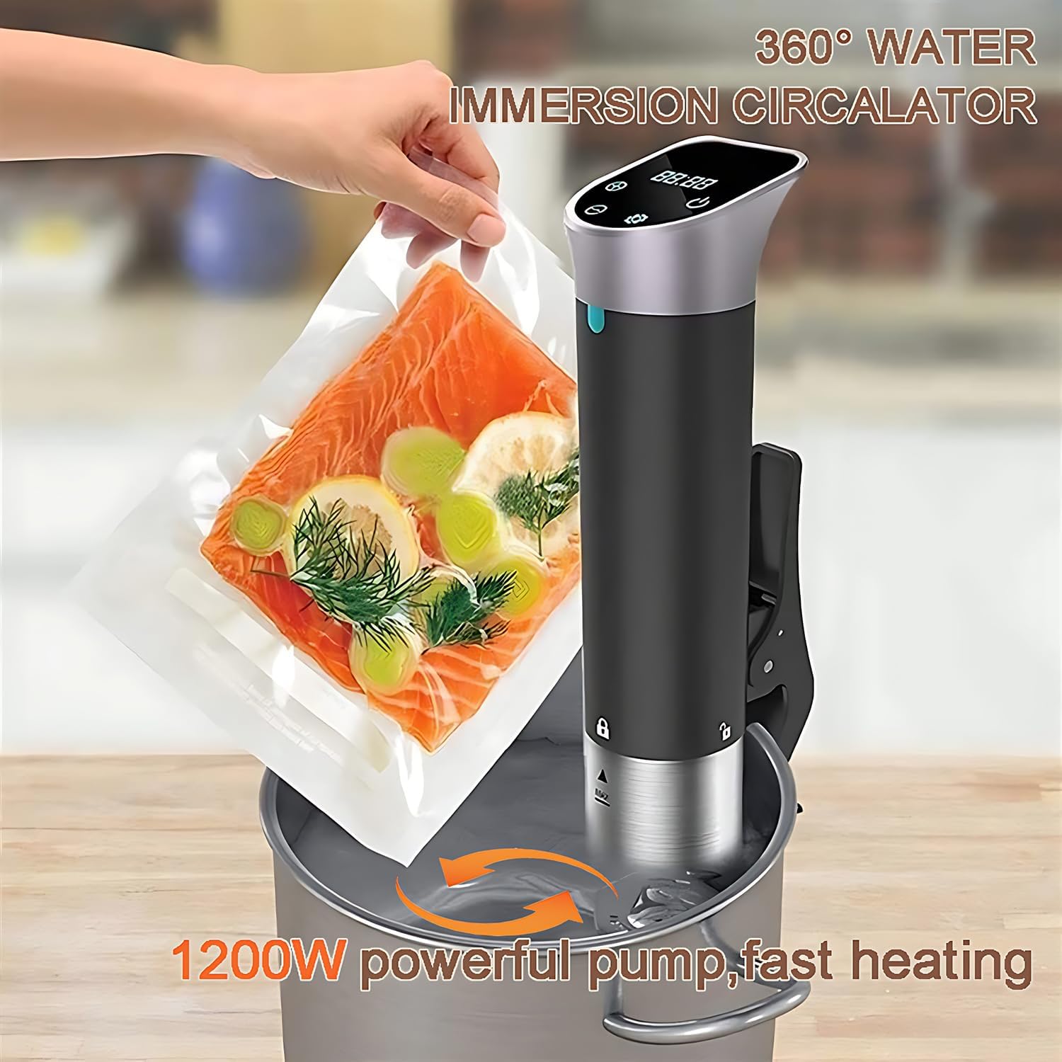The sous vide cooking machine is an advanced cooking equipment with a unique and exquisite working principle. By sealing the food in a vacuum bag and cooking it over a long period of time at a precisely controlled low temperature. This method can preserve the nutrients, Taste and color of the food to the greatest extent. In terms of nutrient retention, Due to the lower temperature and stable cooking process, Vitamins, Minerals and other nutrients in the food are better retained, Allowing you to consume more nutrients while enjoying delicious food. In terms of taste, Sous vide cooking can heat the food evenly, Avoiding the burnt outside or over-drying inside that may be caused by traditional high-temperature cooking. Whether it's tender and juicy meat, Delicate fish or a variety of vegetables, They all present an amazing taste. Whether it is a home kitchen or a professional restaurant, Sous vide cooking machines are constantly changing the methods and standards of cooking, Bringing people a new gourmet experience. Specification: Product Name:Sous Vide Machine Product Color: Black Product Material: Stainless steel Product size: 380mm x105mm x 92mm Product Weight:1100g Rated power: 1200W Maximum water circulation: 23L Water tank capacity: 12L Water tank size: 26 x 28cm Set temperature range: 25-95℃ Actual temperature display: 0-99.9℃ Set time range: 00:01-99:99H