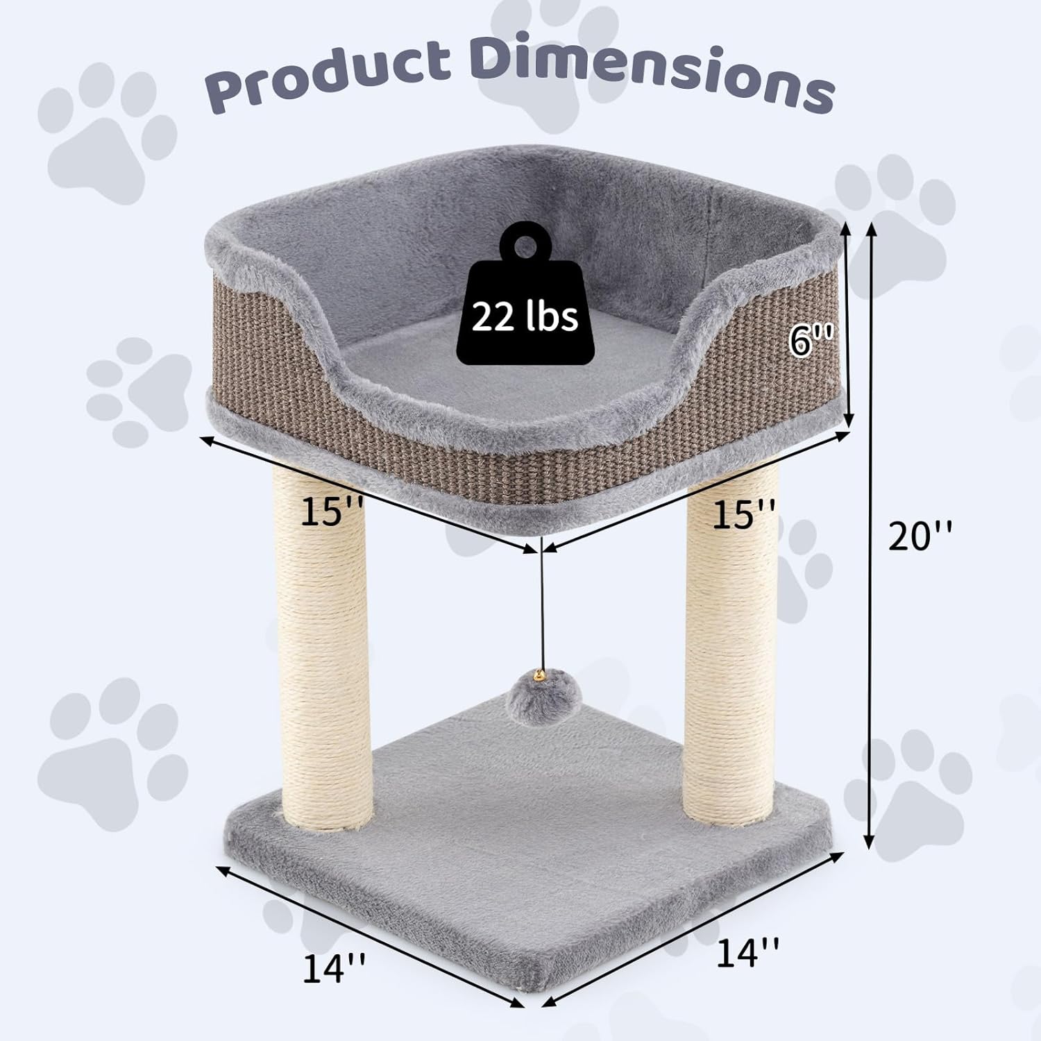 DescriptionWatch your cat unleash their playful side with the small cat tower!The versatile cat activity tree is covered with soft plush material, ensuring a cozy and inviting space for your kitten to rest, scratch, exercise and play. The spacious perch is semi-enclosed, providing a sense of security that allows kittens to enjoy a peaceful nap with ease. Additionally, the perch features sisal carpet on the exterior wall, complete with sisal scratching posts that offer a long-lasting scratching environment for your feline friend. Moreover, the dangling ball will keep your furry friend entertained for hours. More importantly, the cat tree is easy to assemble, allowing your kitten to start having fun in no time. FeatureComfy top perch is ideal for kittens to lounge or observe the surroundingsTop perch with raised edges offer securityFully wrapped sisal scratching posts are built to lastSisal carpet on the perch will satisfy cats’ instinctsInteractive toy with bell will stimulate feline friends to pounce and batUltra soft plush fabric of the cat tree offers gentle touchThick base promises a stable constructionEasy assembly saves your effortSpecificationColor: Light Gray Material: Sisal + Plush + Engineered Wood + MDFOverall Dimension: 15” x 15” x 20”(L x W x H)Base Dimension: 14” x 14”(L x W)Net Weight: 8.5 lbsWeight Capacity: 22 lbsPackage includes:1 x Cat Tree1 x Instruction