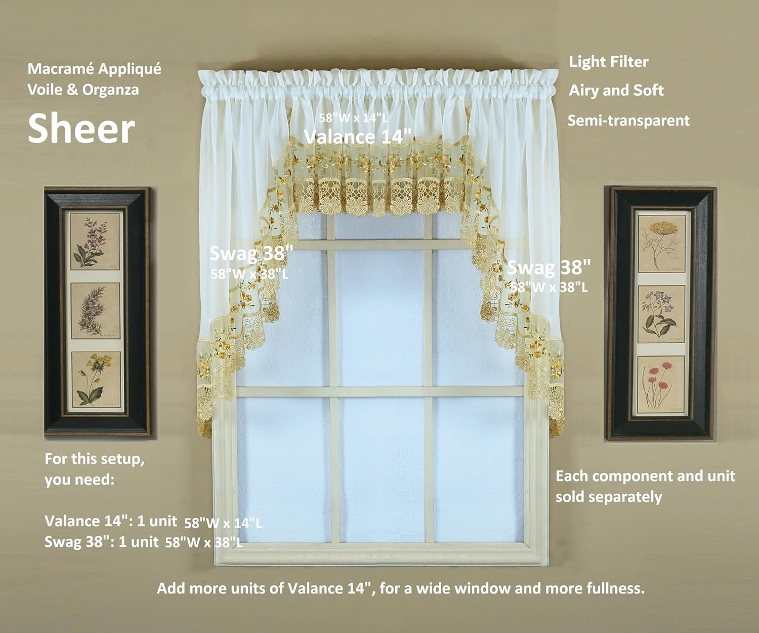Macramé trim patchwork with fine embroidered organza appliqué on voile sheer body. 100% polyester, crispy and soft, a true luxury voile sheer, offering airy and sheery light filtering, and multi-color décor options. Easy care, machine washable. Each component and unit sold separately.