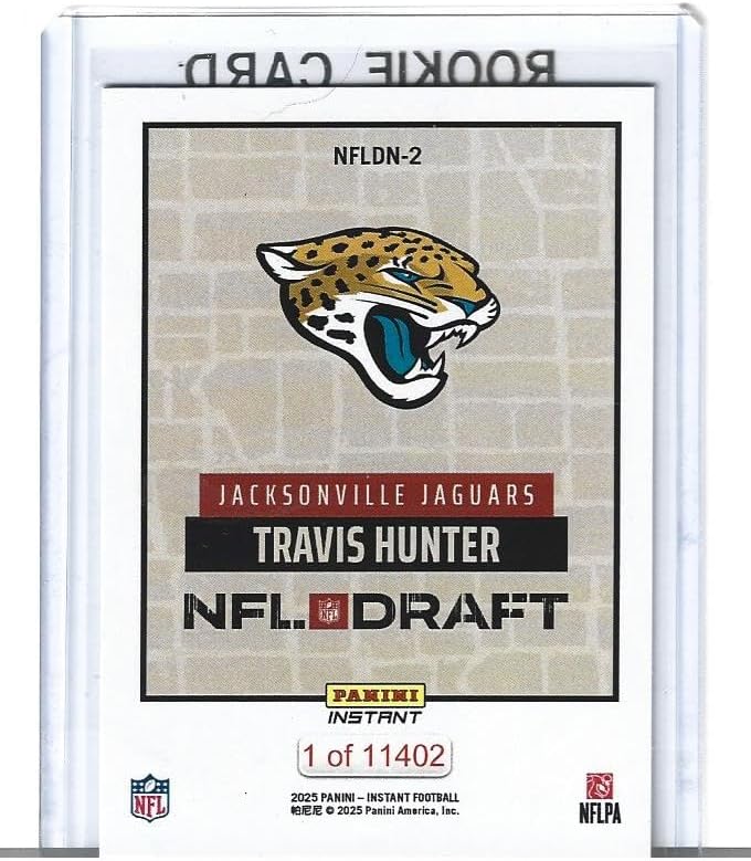 Own a piece of NFL draft history with this exclusive 2025 Football Rookie Card featuring the #2 overall pick. This limited edition card, numbered 1 of 11402, captures the memorable draft night moment. The card showcases the Jacksonville Jaguars' selection holding up his new team jersey. The front of the card displays the official NFL Draft logo, team branding, and the RC rookie designation, while the reverse features the iconic Jaguars logo against a textured background. This Panini Instant card represents a significant moment in NFL history, printed on premium stock with professional quality this card combines collectibility with historical significance. Perfect for serious collectors and Jaguars fans alike, this trading card serves as a lasting memento of the 2025 NFL Draft.