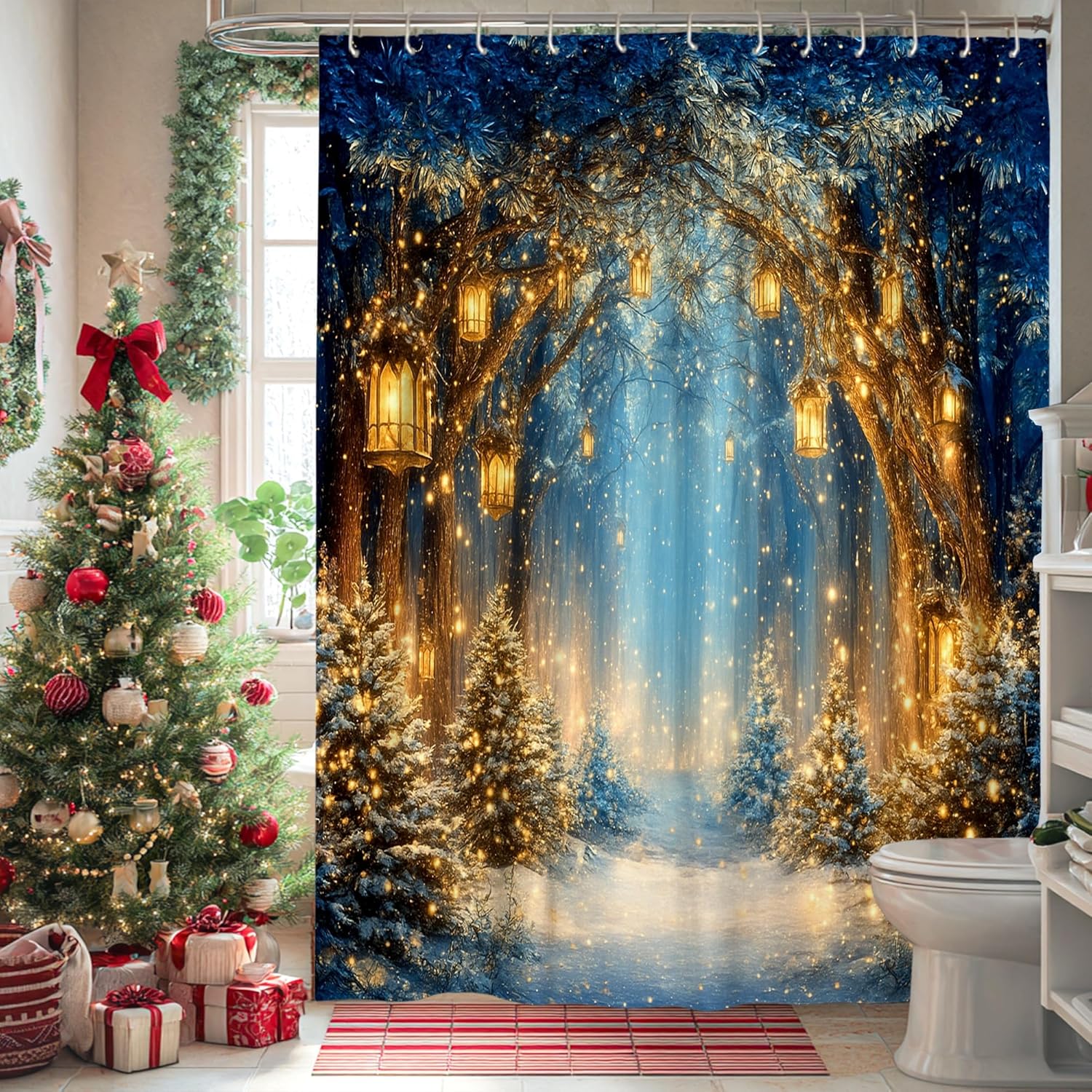 Transform your bathroom into a winter wonderland with this enchanting shower curtain. The beautiful design features a serene scene of snow-covered trees, glowing lanterns, and twinkling stars, creating magical atmosphere. Perfect for the holiday season, this shower curtain will complement any bathroom decor while adding touch of festive charm. Made from materials, it is easy to maintain and fits most standard rods, making your seasonal decorating effortless.